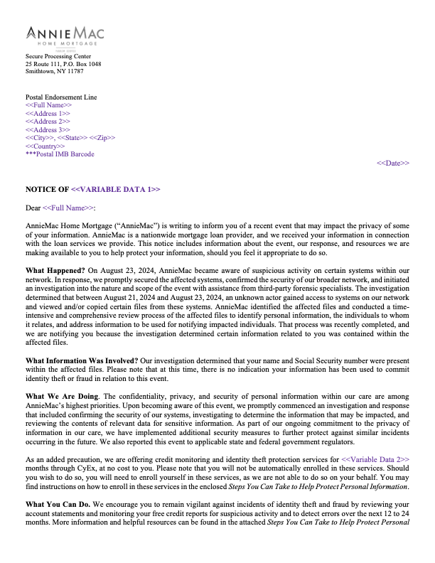 The investigation revealed that the exposed data included names and Social Security numbers of impacted individuals. At the time of AnnieMac’s announcement, there was no confirmed evidence of identity theft or fraudulent use of the compromised information. However, customers are urged to remain vigilant and take advantage of the credit monitoring services being offered.