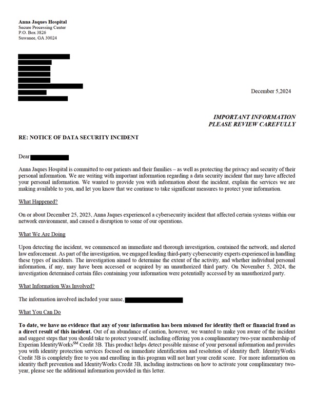 If you received a notification letter from Anna Jaques Hospital, it is important to take steps to protect yourself. Monitoring your accounts for unusual activity and taking advantage of any identity protection services offered by the hospital can help reduce the risk of identity theft. Additionally, you may have legal options if your data has been misused or if you’ve suffered harm due to this breach.